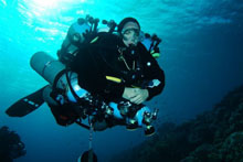 Nagyon komoly veszély volt a cápa. A merülésem során találtam egy búvár tetemet, illetve egy részét láttam deréktól lefelé - a helyiek szerint egy óriás tintahal, de valószínűbb, hogy egy cápa tépte szét. 150 méterre indult, a 100-on lévő biztosító búvár hallotta a visítását. Elvileg a cápa nem eszi meg az embert, de a nyílt vízben egy cápa simán élelemnek nézhet, és megkóstol, az meg már elég. Én szorosan a fal mellett merültem, ott nem támad a cápa.