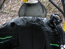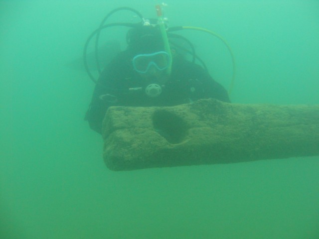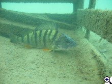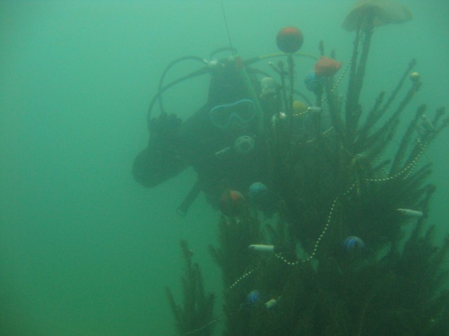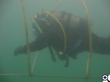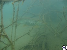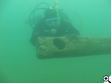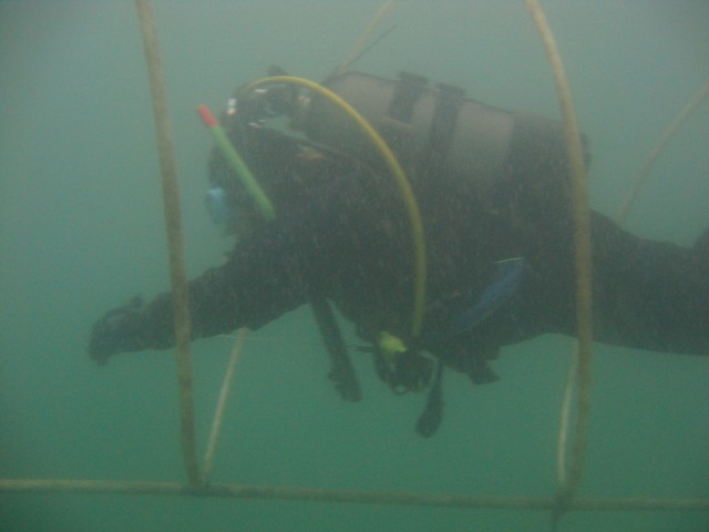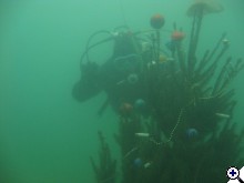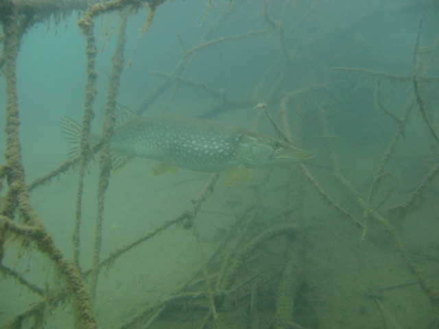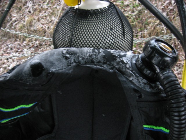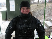 Ahelyett hogy jobban befagyott volna, a szél feltörte a régebbi jeget és kitolta a part felé. A helyén csak gyenge, kásás , könnyen törhető épphogy-jég keletkezett. A szél a látótávnak is ártott egy kicsit, ráadásul több helyen vízibolha-felhő is pixelesítette a vizet (a "barlangszimulátorról" készült képen miattuk látszik szarul a búvár). Kinn jó hideg volt, ugyan kimászáskor azonnal nekiálltunk szétszerelni a cuccot, a kettes számú első lépcsőmet már hajszárítóval kellett leolvasztani a palackról :) ![]() | ||