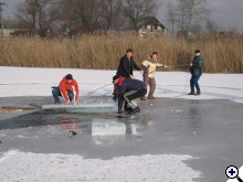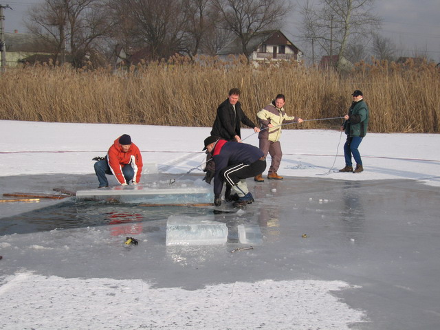 Kilenc órakkor nekikezdünk az előkészületeknek: hótakarítás, lékvágás, csúszásmentesítés, a biztonsági kellékek kiépítése, forraltbor főzés... Két léket tervezünk vágni megfelelő távolságra egymástól, hogy egyidőben többen is merülhessenek, gyorsabban menjen a merültetés. Szerintem 1/2 11 - 11 körül mehetnek az első "kéjencek" a vízbe.
