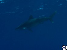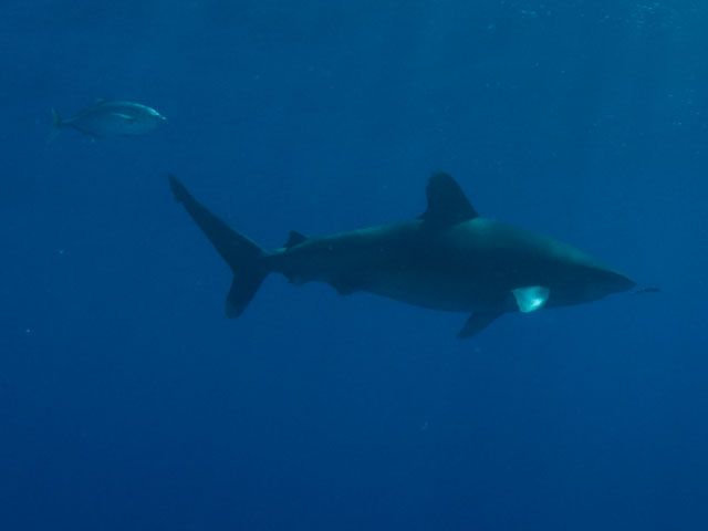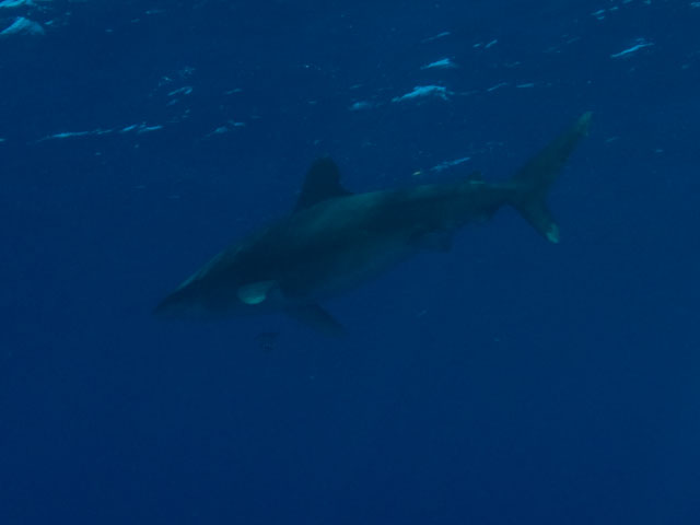 Amúgy 100%, hogy oceanic white longimókus. Egyrészt mert láttam. Másrészt, mert a képen is az van (kerekített első úszók fehét véggel, farokúszó alja fehét, stb. A szürkének rövidebb az első úszólya, a hátsó pedig hegyesebb és fekete betétes). Harmadrész szürke előtt még nem láttam pilótahalat. Negyedrészt, akkor is látuk, mikor a hajó alatt úszkált. Ez egy szépen kitellett, hasas 2.5 m-es longi volt. | ||