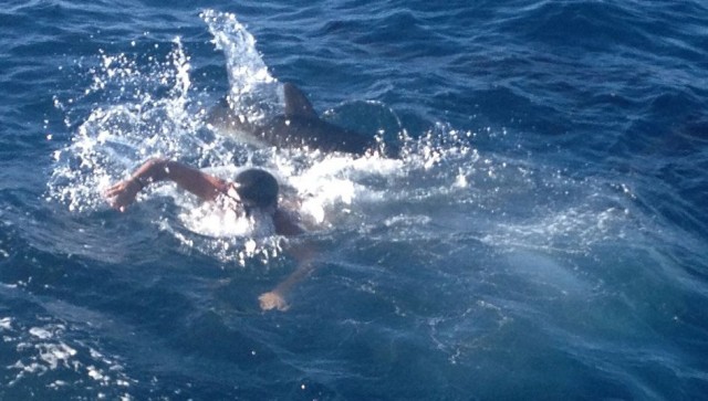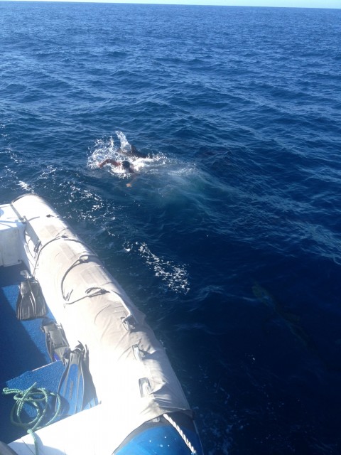 Izraeli srác ebéd után megkérdezi, beugorhat-e a vízbe, mert ott úszkál néhány selyemcápa, és az milyen jó. Azt mondja a DM, hogy nem. Mire a srác: hát má' mér' nem? Erre a DM: Akkor ugorgy, fiam. (Három kisgyereke van, tudta, hogyan kell tapsztalati úton tanítani a gyerekeket.) No, ő be is ugrott. Szép fejes a zodiakból egyenesen rá egy cápára. A drága állat pedig, remekül demonstrálva ezt a feliratot, kissé morcosan üldözőbe vette, és még hívott néhány cápát segítségnek. Erre a srác, megdöntve a gyorsúszás olimpiai rekordját, kimenekült a Zodiakra. Érdemes megnézni nagyításban is: Az akció után persze benéztünk víz alá: Szóval, ahogy Bunny írta: várják a zabát. | ||
