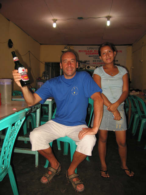 Eloszor csodalkoztunk, hogy a bazison mi vagyunk A vendegek. Aztan kiderult, Gorontaloban (200e ember) MI vagyunk a kulfodiek. Nagyon kedvesek a helyiek itt is, es (nagy nehezen) talaltunk olyan ettermet, ahol sort is adnak. Tekintettel a gyer forgalomra, hideg nincs nekik, de adnak hozza jeget (az is valami).