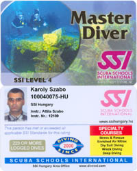 kommandante elmondta a lényeget, SSI-ban a MD más mint a NAUI-ban, ahogy pl. a NAUI scuba diver és a PADI scuba diver között is hatalmas a különbség. SSI MD akkor lehet ha van stress&rescue és még legalább 4 specialitásod, ezután kérhető. Mivel a haladóhoz úgyis van spec, gyakorlatilag az SSI MD és S&R kártya ua, csak a S&r -ra nem lehet speceket íratni, ezért lett egy MD mellé. Én tisztán praktikus okból csináltattam meg, amit már kifejtettünk, így ahogy szudánban talán láttad egy két fakkos átlátszó hitelkártyatartóval megyek összesen. Egyik fakkban a búvárorvosi igazoló kártya van (néha kérik), a másikban meg a MD, amin rajta a nitrox pl. és mellesleg pár száz igazolt merülés meg az, hogy mióta merülök. Így aztán két kártyával letudva minden, nem kérdeznek semmit mert minden fontos adat rajta és hagynak merülni :D Tudod, informatikus vagyok, szeretem optimalizálni a dolgokat. Itt a kártya, nehezen olvasható, de láthatod a sárga mezőben a speceket. Ez egy hasznos tulajdonsága a kártyának :D | ||