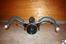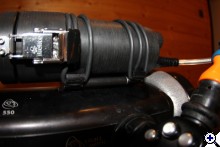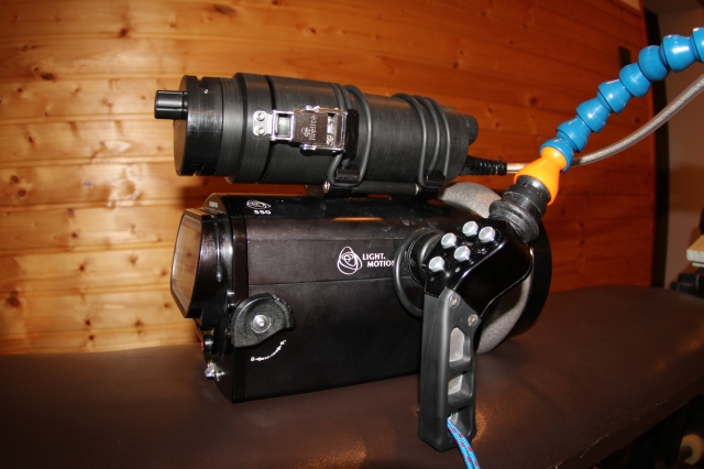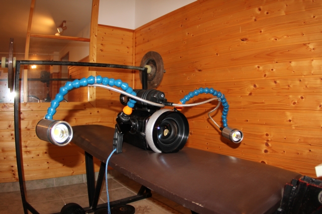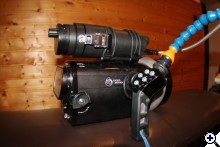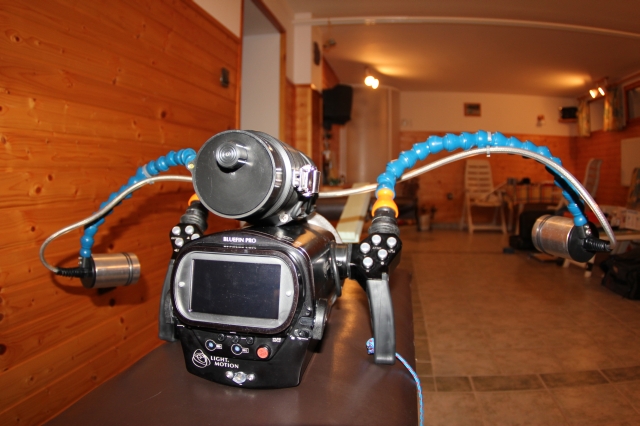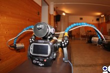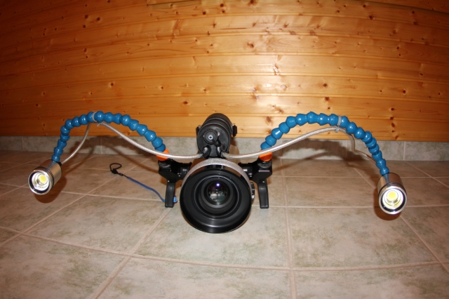 Huhh... kicsit meglepő, hogy a tok tetejére szerelted az aksit. Bár a tok súlypontján nyilván sokat javít, mert amúgy marhára orrnehéz a bazinagy széles látószögű lencse miatt. Vasárnap egy órát szívtam vele medencében, mire sikerült besúlyozni. Sokat javított a lámpa karokra húzott polifoam.
