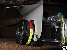 Minap az irodában kortyolgatom szokásos üdítőmet, amikor is mint villámcsapás ismerem fel a megoldást; hát ez pont olyan amilyen kell nekem! (tudni kell, végigjártam az összes barkácsáruházat, felkerestem az összes gépész online üzletet, de hiába) Hazasietve gyorsan felvágtam a műanyag üveget és láss csodát, az átmérője mint a mesében. Elkészültek -szárazon- az első próbaképek, melyhez takarásképp' egy fekete zokni igen jól szolgált. Az egész történet kb. 18 perc, 350 Ft-ból (persze a fotós szett nélkül). Az eredmény a képsoron: Persze az oldható rögzítésen még agyalok, meg a bevonat, stb... ![]() | ||