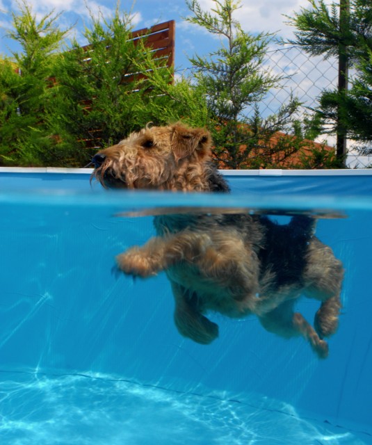 Ha nem figyelek oda beugrik ő magától a medencébe pedig az 80 cm magas. Tavaly sikerült neki, igaz ő is meglepődött. Hepike igazi búvárkutya, egész nap vizezne. Idén már szétrángatta egyszer a slagot, és az egész kertben állt a víz, még a biztositékot is lecsapta. Hajnalban részegen át kellett másznom a keritésen, hogy bejussak, mert kulcsom nem volt csak távirányítóm. :-)
