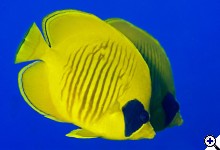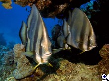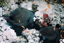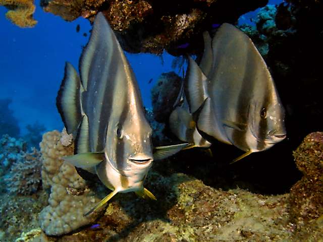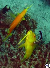 A kép nem rossz, de a témához való illeszkedésével személy szerint nem vagyok kibékülve. Az előtérben lévő dülledtszemű hal (Priacanthus hamrur) szépen van elhelyezve, a hátsó kevésbé. Jók a színek, de szerintem a nem elégséges részletgazdagságán a képnek látszik, nem erre szakosított eszközzel készült. | ||