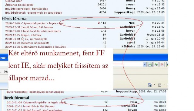 Csináltam egy gyors tesztet: bejelentkeztem FF-ben és IE-ben is. Először volt két olvasatlan üzenet az egyik topic-ban. A másik munkamenetben ezt elolvastam, majd fórumoztam mindkét böngészőben. Az eredmény a mellékelt képen látható. Az új fórumtémák nem kerülnek szinkonizálásra. Vagy most nagyon félreértek valamit? ![]() | ||