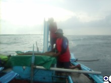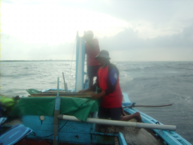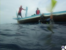 Az egyik csapat ment az áramlattal balra, a mi guidunk pedig egy ideig a jobbra, a bejárat felé vitt minket áramlattal szembe, aztán egy ponton szinte megszűnt az áramlás, ott bóklásztunk. Majd nem a bejárat felé entünk tovább, nehogy besodorjon, hanem visszafordultunk, és drifteltünk. A hajó az első csapatot követhette, amikor feljöttünk nem láttuk, csak egy kis halászhajót. Enyhén sodródtunk a nyílt víz felé. A hullámok is akadályozták, hogy a hajót lássuk. Aztán kb. 10 perc múlva a halászhajó felvett minket. Onnan felállva aztán már a dhonit is megláttuk. ![]() | ||