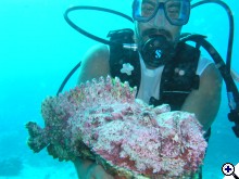 Mellelsleg abban igazat adok, hogy nem kellene ilyen példát mutatni, sőt, egyáltalában nem kéne baszkurálni a tengeri herkenytyűket, hacsak azok nem akarják. (Ellenpélda a tisztítórák, aki maga mászik rá a kezedre, takarítani, vagy a szerelmes napóleon, de volt már császárhal is, aki hozzám dörgölőzködött). Ezt a DM-t sokan nem szeretik, sokan pedig odavannak érte. Anno már én is kértem egyszer, hogy ne ő legyen a vezetőnk. De ha egyszer szarban lennék a víz alatt, lehet, hogy őt látnám legszívesebben mellettem. | ||