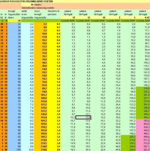 ![]() Látom nagyon megy a vita, hogy mennyi időre elég a Spare Air palack. Csináltam gyorsan egy excel táblát, az utolsó oszlop a Spare Air 0,42 L-es. Vettem egyet régebben és néha-néha felcsatolom, ha olyan a helyzet. Igaz elég ritkán. Látszik a táblázatból, hogy annyira elég, hogy felszínre érheszt vele biztonsági deko betartása NÉLKÜL 10m/s emelkedéssel kb. 20m-ről. Ha az emelkedési sebességet növeled, 18m/s-re akkor 30m-ről tudsz feljönni. Ez még mindig jobb, mintha fellövöd magad, vagy nincs levegőd. Ha felértél még mindig esélyed van valamit intézni. pl. bedobatsz gyorsan egy cuccost és visszamész 3 m-re dekózni. stb. stb. Szerintem jó dolog, csak tisztában kell lenni a korlátaival és nem kell csodákat várni tőle. | ||
