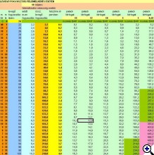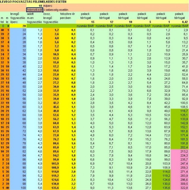 ![]() tessék itt a 18m/s -es táblázat is. Látszik, hogy 30m körül fogy el a 200 Bar. Persze ez elmélet. A gyakorlatban úgysem tudsz egyenletes sebességgel emelkedni és valüszínűleg gyorsabban is jössz fel a kelleténél pláne a bajban vagy. Azt se felejtsük el persze, hogy nem kell feltétlenül FELÚSZNI!!! elég lehet arra is, ha látod, hogy egy búvár közel van ahhoz, hogy el tud érni azon a szinten ahol éppen vagy. Persze itt aztán tényleg döntened kell. Áramlattal szemben kamerával a kezedben nem biztos szerencsés a manyus után tekerned, mert lehet, hogy gyorsabb nálad :o) Én valószínűleg felmennék inkább. 40-m-ről nem sok esélyt látok viszont a szerencsés felérésre. Ott jobb lenne azonnal valakit keresni a közelben, esetleg megbánni minden eddigi bűnödet. :o) | ||