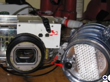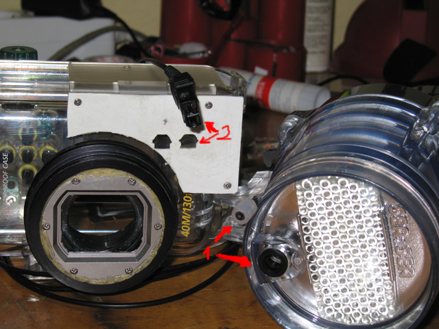Barkácsvonalat megnyitva fokszy kolléga kívánságára az optikai vezérlés canon tok és sea&sea vaku között.1-es számmal jelölt kábelvég a jelölt lukba becuppan, a kettes számmal jelölt gyári csatlakozó meg a kis házikóformájú lukakakba. A fehér műanyag emellett jótékonyan kitakarja a belső vakut, viszont pont az elé tartja az optikai kábeleket, amelyeken fénysebességgel átskerázhatnak a fotonok a vaku érzékelőjéhez. nyissz-nyassz. | ||