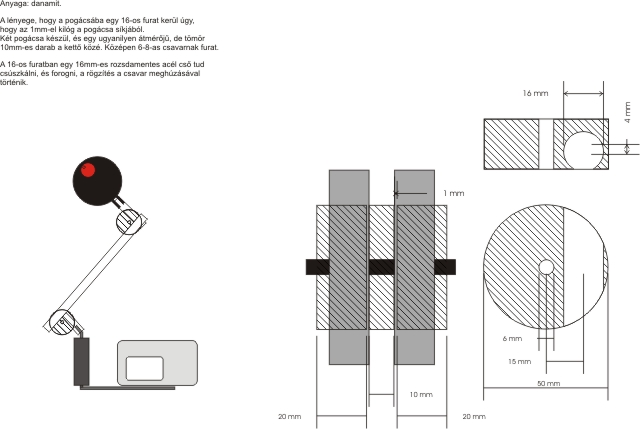 Gyártási folyamatot elég hosszas lenne leírni, de eszterga és tisztességes oszloposfúró vagy maró nélkül nem nagyon lehet elintézni. Itt van a sematikus rajz, amit anno készítettem, annyi változás van talán, hogy a furat nagyjából fél milivel lóg csak ki az anyagból, az eredeti 1mm túl sok volt. A két forgórész között egy rugalmas műanyag van, de működő megoldás, hogy ott is danamid korong van, a két oldalán pedig gumi, pl. motorbelső tökéletes. Jó szórakozást :)