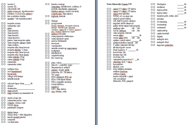 Kicsit "offtopic-ként" némi felszereléses téma. Minden úton para van, hogy mi marad itthon, vagy mi marad a hajón. Lehet csak én vagyok rövid memóriás, de ez nálam elég hosszú pakolást okoz, ténfergést mi marad ki, hazafele meg reménykedés, hogy mindent elraktam. Mivel most épp baromira ráértem, kitaláltam egy ellenőrző listát. Felírtam rá minden búvárfelszerelésem amit találtam, plusz a legfontosabb ruhákat, iratokat, egyéb cuccokat amiket vinni kell. Minden tétel előtt van két box, az elsőbe pipa azt jelzi, hogy bepakoltam, a második pedig azt, hogy visszafele is beraktam a táskába. Így egyrészt gyorsan le van ellenőrizve, nem marad-e a hajón valami, másrészt itthon a bepakoláskor nyugodt lehetek, hogy mindent elraktam ami kell.