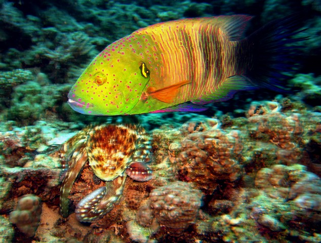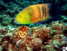 Eleget téve Garf felhívásának, néhány kép, amit hirtelen előkaptam a rodoszi elutazásom előtt, mint válogatási alap: Az 1. kép gyakorlatilag az első olyan merülésemen készült, amikor a kompaktomat vittem magammal a víz alá. Bevakuztam egy üregbe, amiben valami mozgott... A 2. nem érdemel szöveget... A 3. ról annyit, hogy polip-sexet próbáltam fotozni, amikor a képen látható hal odatévedt és kapásból, ráhúzva exponáltam... A 4. kép most készült Rodoszon semmi esetre sem pályázati kép célzattal, csak érdekesség. Viszont elvileg megfelel a kiírásnak... ![]() ![]() ![]() | ||