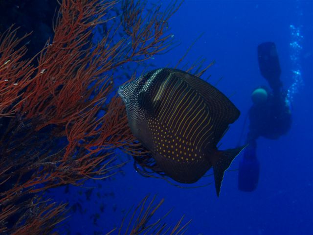 Legkedvesebb merüléseim között előkelő helyen tartom számon azt a lanzarottei parti merülést, amit ketten abszolváltunk, lassan nézelődve, kb, 20 nm területet végibóklászva, töb mint 60 perces merülésen. Ráértem végre odakönyökölni a szikla peremre, és megvárni, amíg a halak kíváncsian odajönnek megnézni, hogy ki a fene is vagyok én, és mit is akarok itt ezzel a zajos buborékfelhővel. Mint a kiskutyákkal lehetett velük játszani is.Mondtam is, hogy én mindig ilyen merülést szeretnék. Soha többet nem akarok nagy sziklákat körbe körbe úszkálni áramlással szemben. De ez a kisszék! ez még nekem se jutott eszembe!...:-))))