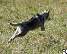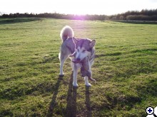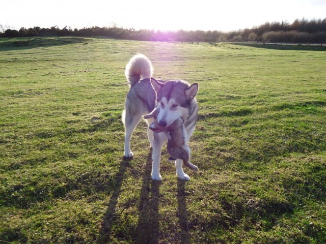 Középre komponált, hátulról megvilágított fotó. A képen szereplő malamut arcán látszik, hogy prinkodik, amiért a gazdája plüssnyulat tolt a szájába, csak hogy felvághasson vele a fotós fórumban.