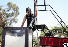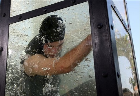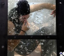 Bonyolítsam még? Mi van, ha dupla falú a ketrec, abban nyomják a buborékot, az ipse meg ül középen szárazon és szenved? A csuklya pedig azért van a fején, ne lássuk, hogy nem lebeg a haja. Jelzem egy kameraállás van, oldalról, az is erősen vágott.