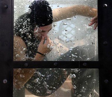 Na, és az is beszédes, ahogy kijön a vízből. Figyeljétek meg egy légszomjjal küszködő, láthatóan "szenvedő" ember az ájulás határán, az úgy bukkan fel a víz alól, hogy mindkét tenyerével betemeti az arcát (orrát és száját)? Nem, az hátravetett fejjel, még a fülén is levegőt vesz, kivéve, ha vissza kell tukmálni a csuklya alá egy kikandikáló csövecskét.
