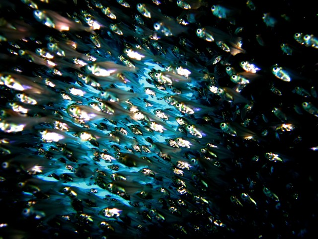 Nem biztos, h meg tudom fogalmazni, de látok benne vmi egyedit, nem olyan unalmas halraj, mint amiket Te is fikáztál!:-) Tetszik a 2 kék kontrasztja és az, h az üveghalak nem teljesen élesek ad a képnek egy misztikus jelleget. De legalább kivehetőek ezek a biztos nem egyszerűen fotózható halak, nem úgy, mint Zook üveghalas képén... Azért ez utóbbit sem szeretném szidni, mert a mezőnyben még mindig dobogós, legalábbis számomra!:-)