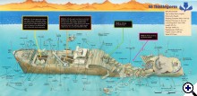 Ja és az sem világos, hogy közlekednek a búvárok. Arról volt szó, lesz egy vezetőkötél a roncshoz, de az nincs az ábrán, remélem csak lemaradt, mert ha valóban nincs, egy áramlásos napon (ami szinte minden nap van) megnézem, ahogy elúsznak a hajóig a mellette kialakított kötéltől.