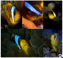 Bunnytól meglepően jó felvétel. Nagyon hatásosak a színek, a piros a kékkel benne a sárga bohóchal. Zavaró a kis sötét színű hal, meg lehetne több bohóchal a felvételen. Picit még lejjebről fotózva talán jobban bevehettük volna a képkivágásba a felszint és több türelemmel jobb pozicíóba kerülhetett volna a sárga halunk. | ||