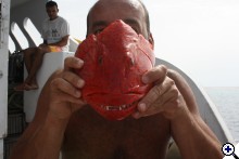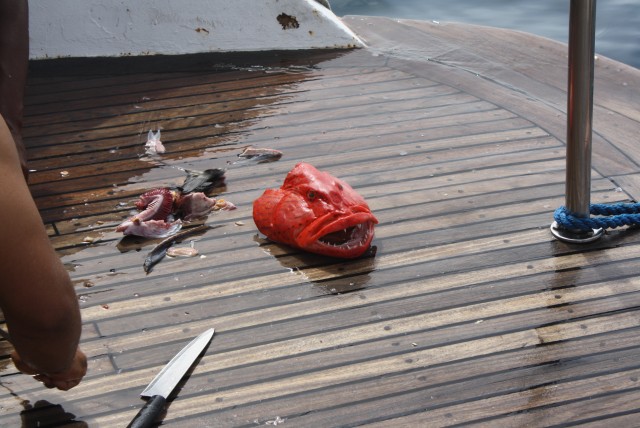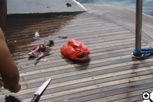 miután szembesítettük, hogy ez nem sikerült, maszkkal próbálta a helyzetet (arcát) kozmetikázni: ![]() a maszk és egy kés, amivel megpróbált harakirit elkövetni, de mondtuk neki, elviseljük ezzel a képpel is: ![]() szegény sügér a gálavacsorán végezte, a maszk ugye a dekken, a belsőségekről nincs felhatalmazásom nyilatkozni (állítólag a cápák ették meg): ![]() | ||