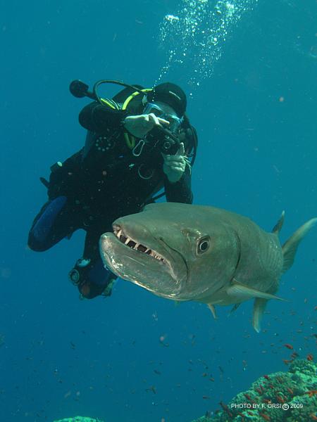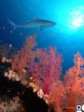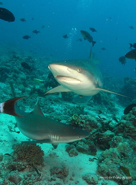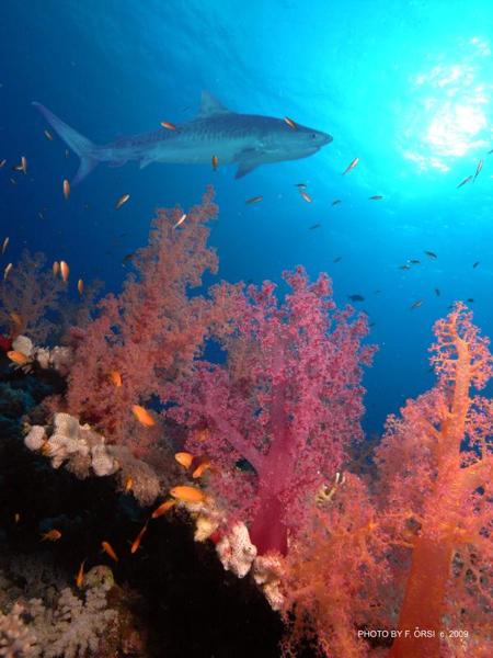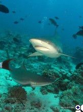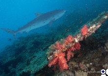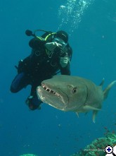 ők kilencet merültek a tigrisekkel..... Akkor nyolc, jól megkülönböztethető egyed volt ott. Szerintem ez világszenzáció, ha a NatGeo megtudja, tuti, hogy külön expedíciót fognak indítani oda. Soha nem olvastam, nem láttam ilyenről. Aláhúznám, hogy ezek nem odaszoktatott, évek óta etett, idomított tigrisek voltak, hanem először láthattak búvárt. Nem mondom, hogy nem respektáltam őket, mert az nem lenne igaz. Amikor 5 méteren, a zátony felett megláttam az első kapitális példányt, "kicsit" késve kapcsoltam be a gépemet - egyszerűen hihetetlen volt, hogy ekkora cápa egyáltalán létezik! Aztán 35 méteren egy szürke jött előtte - kb, az volt az arány köztük, mint a szürke és a sucker fish között.... Nem is a hosszuk volt a lenyűgöző, hanem a testátmérő és az állkapocs szélesség. Simán áthúzhattuk volna a testünkön, mint egy hula-hopp karikát, ha ki lett volna fejtve..... | ||