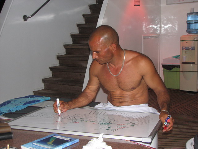 Hát már pár nap után pedzgettük, katonai múltja okán az admirális elnevezést, de fixre akkor kapta meg - tőlem legalábbis -, amikor Sanganeb South-nál a merülés végén nem a megbeszélt helyen (a világítótorony lagúna felőli mólója végénél) volt a Cassiopeia. A másik zodiac simán elrobogott a picit messze levő hajóhoz, de erre Mimo Admirális nem volt hajlandó, a zodi fiút utasította, hogy csakazért is a megbeszélt helyre menjen, a hajó jöjjön csak oda... 20 percet napoztunk a neoprénben, míg odaért a hajó, jóvót. :)