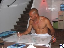 - Igen, mi csak Shaab Rumin majd többet merültünk, mint atengercsenjéék összesen. Az élet igazságos. - Nem. Minden hajónak más tulaja van és más szervezi a népet. Annyi a közös, hogy a helyi transzfereket nagyrészt az Uwe csávó intézi, mint egyetlen utazási képviselet Port-Sudanban. A digók régen egyeduralkodtak, és utálják a "újfiúkat", továbbá mindenfélével keresztbe akarnak tenni a többieknek (főleg vonatkozik ez a Cassiopeiára, ami méreténél és kényelménél fogva nattyon böki a csőrüket). Monnyuk a zodiacjainkat nem irigyelték... - Igen, a nyúlvadászat elmaradt, és ez az én bűnöm. De anno a Schindler listájában megragadott egy mondat: "az az igazi hatalom, ha nem teszed meg, amit megtehetnél...". Meg aztán nem kellett őkelmét vízbe dobni ahhoz, hogy vigyorogjunk rajta. Volt néhány emlékezetes felúszása whitetip, barakuda, cápa nyomában (egy plató röhögött jókat halastól, korallostól) és számomra örökre felejthetetlen marad a "modell kerestetik és oktattatatik" vetélkedő, szegény Kisha győzelmével(?) :-) Az Admiralt én oktattam ki először, hogyan kell leönteni a mocsok locsolós bandát (akkor azok lapítottak épp a főnök előtt, mert rosszaságon kapattak), oszt rendesen rászokott. Sőt, nagyon tiszteletlenül, egy csomószor engem is leburított. | ||