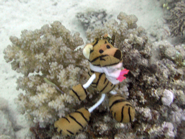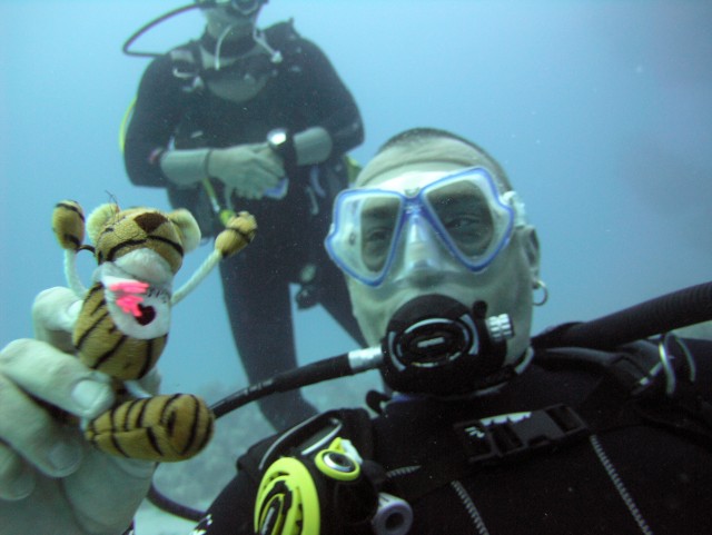 Mivel részletes mesélést kértek többen, ezért azzal kezdeném az én tigrises storymat, hogy hajnal 5,15-kor a tengerparton ücsörögtem egy redbullal a kezemben, és néztem a napfelkeltét. A szellő bársonyosan simogatta a bőrömet, kissé álmos szemeimmel a távolba merengtem. Angol merülőtársaim még nem érkeztek meg, egyedül voltam. A tenger csendes volt, a víz sima. Ez egy igazán tökéletes reggel volt. Arra gondoltam, hogy vajon lesz-e áramlás, és bíztam benne, hogy könnyű, élménydús merülés vár ránk. Nem volt kedvem a nagy kihívásokhoz, inkább csak ráültem volna valami gyenge áramlatra mint a teknősök a Némoban, és vitettem volna magam a "futószalagon". Arra is gondoltam, hogy vajon látok-e végre polipot, mert már nagyon rég szerettem volna a Vörösben velük találkozni, de ez még csak félig-meddig sikerült. Akkor is csak üregeikben szuszogtak korallnak álcázva magukat, én pedig úszni szerettem volna látni őket. Épp itt tartottam, amikor a guide is megérkezett, és elkezdte homokból megépíteni Elphinestone zátonyát. Nagy gonddal igyekezett méretarányosan megalkotni a platókat, a zátony "fejét", és minden kis apró részletet.