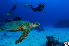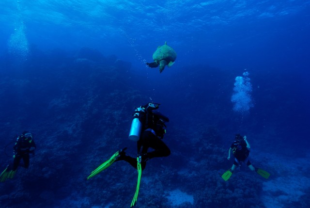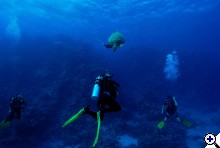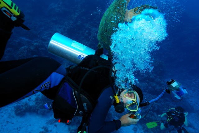Szóval egy szép zátony, átlagos merülés. Már a végén jártunk, amikor csörrent a jelző, előttünk, fent a felszínen mutatják a tekit. Megálltunk, lehettünk vagy 12 méteren. Pont irányban álltunk. Ezt a teki is észlelte, mert aranyosan nézegetett lefele, mi (ki) áll az útjában. Többször lenézett, levegőt vett, megint lenézett. Mintha azon gondolkodott volna, mit tegyen. Aztán alámerült és veszettül el kezdett úszni. Felém! Mint egy német zuhanóbombázó, pillanatok alatt elért! ![]() Azt hittem kikerül, de nem. Behúztam a fejem, de még így is súrolt, kaptam egy maflást is, majd a hátamra (palackomra) vetette magát. Szemtanúk szerint előbb el akarta zárni a palackomat, de kitérő manővert tettem, ez megzavarta. Rávetette magát a hevederekre, de nem tudta kipattintani. Dühében aztán a palackot akarta meglékelni. ![]() Már éppen komolyra fordult volna a helyzet, amikor Jani elcsalta kamerájával, így megmenekültem. Neki olyan hatalmas gépe van, nagy buborékkal az elején, amibe ha belenézünk, láthatjuk tükörképünket. Nos, a teki is ezt láthatta, mert onnantól az nagyon érdekelte:) Percekig szórakozott velünk. Majd lepihent egy korall mellé a homokba, kb. 18-on. További hosszú percekig voltunk vele, rengeteg kép készült. ![]() Jó dolog tekivel találkozni, sajnos egyre ritkábbak. Az meg külön jó, ha több időt enged meg eltölteni magával, esetleg kapcsolatot teremt, még ha azt ilyen különös formában teszi is. Azt hiszem kellő tisztelettel bántunk vele és hála kíváncsi természetének, felejthetetlen perceket szerzett a 7 búvárkának. Mindhárom kép Halász Jani műve. | ||