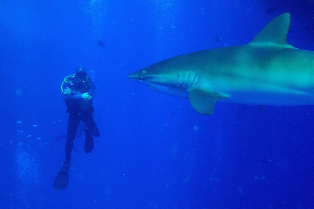 Nem is rokonyok, a cápa nem fonja össze a zuszonyát, és nem is pózol, inkább egy kis hamira vágyik a búvárt nézve.