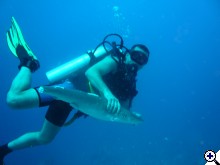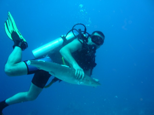 Ami viszont elszomorító, hogy a déli zátonyoknál (Abu Fendera, Elba) elég keményen nyomják a helyi halászok a dinamitos munkavégzést és a cápauszony begyűjtést... Néha úgy nézett ki a "beautiful sandy bottom", mint egy harcmező bombatámadás után és a több cápatetem uszony nélkül a víz alatt sem volt túl szívderítő... Akik most mentek, azok jól belefutottak egy erős szeles hétbe, nem irigylem őket. A Travel service a nagyobb csomagokat kifelé nézte, a kéziket nem, hazafele meg kézi becsekkolás volt mindenfajta mérés nélkül a helyi szerver hibája miatt. Zanzásítva ennyi. És egy nem túl vidám kép (nem a képen szereplő búvár művelte ezt a cápával!) | ||