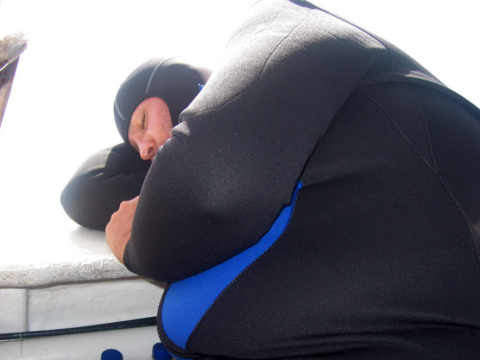 Nekem még a velem egy idős kapitány tetszett nagyon. Reggel söprögetett. Aztán kivitt minket merülni. Ebéd után szunyókált egyet. Aztán megint kivitt merülni. Este vizet hozott a lajtos hajóval. Közben napjában többször összefutott a gyerekeivel nejével. Együtt voltak. Ez nagyon szimpatikus volt. Ja és sokszor együtt fociztak a falatnyi parton. | ||