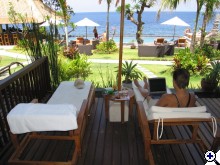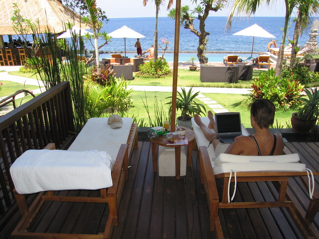 Súgok. Balra az én ágyam, a dc sapkával. jobbra Adri épp a nonlimit internet előnyeit élvezi, előtte a zöld az fű, mondjuk 10 lépésnyi aztán egy kb. 30 fokos medence majd a tenger. És a felhőtlen ég, vacak is itt, még jó hogy esős évszak van. Két nitroxos merülés után még mindig frissen, 15p múlva meg megyünk egy muck dive-ra, amíg ti otthon szunyáltok épp.Hát így telnek napjaink drága Garfield barátom, remélem jó neked otthon :P | ||