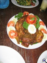 mi utolsó nap csirkét ettünk, egészet, töltve előző nap kellett szólni, mert annyi idő kellett, míg összérett a dolog...ez szintén az Ayu's volt... | ||