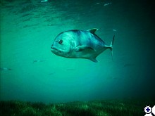 Az általad említett Monotaxis grandoculis egyébként nagyszemű császárhal néven fut (októberben egész rajjal találkoztam Gota Abu Ramadá-n), a képen tüskésmakréla v. makrahal (Caranx ignobilis) látható, a nagy kék lapos hal a Pseudobalistes fuscus nevű zöldszemű kék íjhal, a sárga-fekete íjhal pedig, ami neki is ment egy búvárodnak, az az óriás vagy bajuszos íjhal, amely a Vörös-tenger egyik veszélyes hala (fészkét védve komoly sebeket is okozhat).