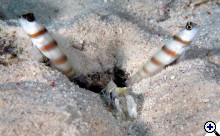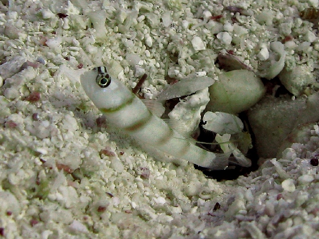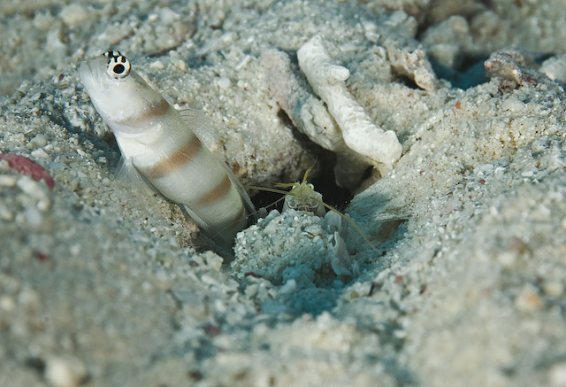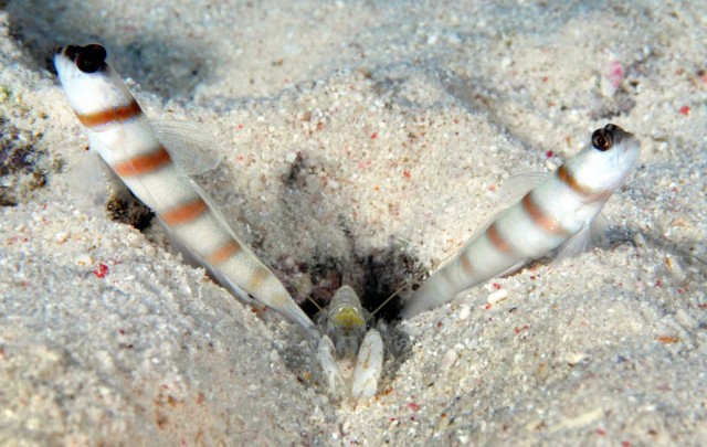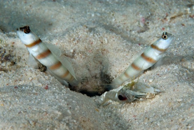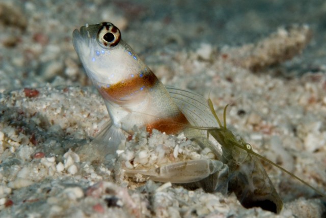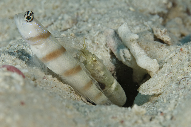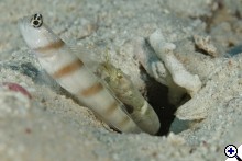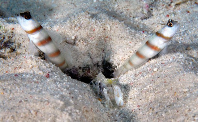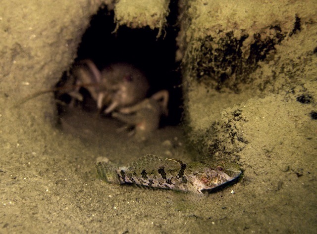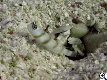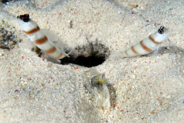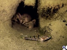 Ha valaki (pl egy fotós közelít), a gobi nem engedi ki a rákocskát (mert ő a sérülékenyebb), hanem visszapofozza a farkával. Néha a rák renitenskedik, és mindezek ellenére kibújik. Ha meg nagyon nagy a gáz, a gobi is eltűnik a lukban. Egy jó felvétel kedvéért néha 10-15 percet is kell várni. Addigra megszokják a fotóst (videóst) és nem félnek. Balin millió ilyen van. De a Vörösön, Atlabntin, sőt még az Adrián is akad. | ||