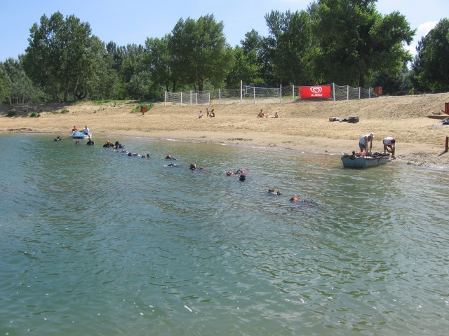 Én (mi) most voltunk először takarítani és máris két zsák cuccot szedtünk össze (igaz, kedvenc oktatónk és barátunk, Frici vezérletével), borosüvegektől (sajnos a mieink üresek voltak) az azbesztcement hullámlemezig. Jövőre is jövünk, mert a fél pár báli cipő párját is meg akarom keresni, hátha herceget is találok hozzá. A tó is kegyes volt: egy némileg sértődött és méltatlankodó, de szép, megtermett rákkal is szemezhettem kb. 10 centiről (mert 15-ről már nem láttam volna belőle semmit).