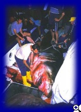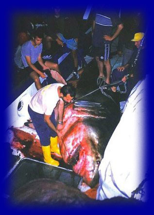 Ha szerencsések vagytok, talán még mást is láthattok! 2003 június 24.-én fogták ki, szintén Jabukamellett, a képen látható nagy fehért. A teljes hossza 5 méter 70 cm volt, és ezzel a mérettel az eddig ismert legnagyobb példány a horvát vizekből.( 1998-ban, az olasz parti őrség naszádjáról kaptak lencsevégre, egy, a hajó mellett, közvetlenül a felszín alatt elúszó példányt, amely valamivel hosszabb volt, mint 6 méter, így ez az adriai rekorder jelenleg.) Egy angol expedíció a Kornatok térségében, a külső szigetektől mintegy 15-20 NM-re a nyílt tengeren kutatott három egymást követő nyári szezonban kékcápákat. Zömében juvenil egyedeket azonosítottak, sajnos, nem túl sok példányt,amely a nagyméretű populáció csökkenés bizonyítéka. Volt, hogy két hétig egyetlen egyeddel sem találkoztak, viszont két alkalommal észleltek heringcápát is. Járjatok szerencsével, sok sikert! Üdv: Shark | ||
