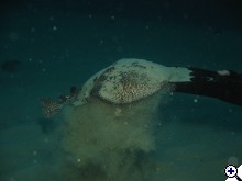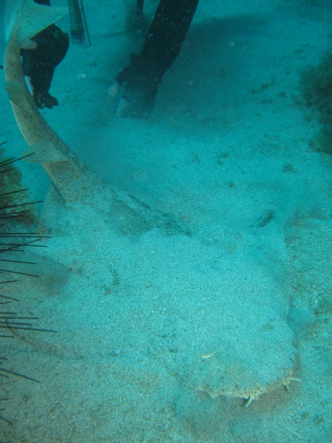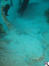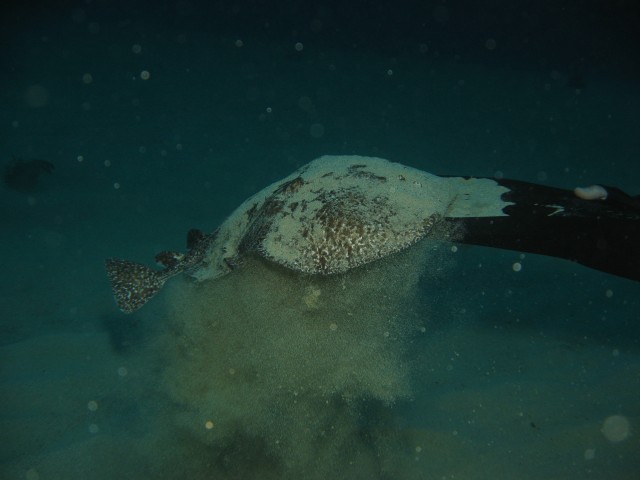 Az elektromos rája talán még jobban elbújt a homok alatt, mint az angyalcápa. Azt fotózgattam, amikor arra lettem figyelmes, a merülésvezető leveszi az egyik uszonyát, és ásni kezd:) Nem sokkal később egy igen szép példányt kotort elő, nem mert hozzányúlni, csak az uszonyával:) Ijedten nézte, mikor odahasaltam fotózni:D A két dög nagyon közel lapult egymáshoz. Én egyiket sem vettem volna észre magamtól... | ||