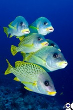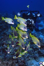 Szépen összeálltak csepp formájúra, tehát ebben is benn volt egy jó kép lehetősége. De a technika ösmét gyenge volt egy ekkora rajhoz, vaku kevés, és valszeg életlen is egy kicsit. A jobb oldali korall nem kellene bele, ki is lehetett volna vágni, és jót tenne a képnek, ha kb 20 fokkal jobbra dölne (a teteje), úgy átlósabb lenne a halcsapat.... | ||