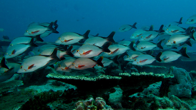 Mielőtt még eredményhírdetés lenne... hogy legyen egy kis fikázás is. Valaki, aki ért hozzá, szakmázhatna is.Tulajdonképpen nem is rossz. Bár csak egy rakás hal, a fekete szemek fogják a tekintetet, és az épp átsejlő búvár sem zavaró a képen. Persze a színén meg a gammáján lehetne egy kicsit állítani, kontraszt is ráféren, de egy totál kezdőtől egész jó (akarok még szalkra menni....) | ||