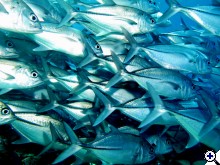 Halrajnál az is piszok nehéz, hogy lehetőleg ne legyen levágva senki (vagy minél kevesebb). Ezen a képen sajna egyetlen egész hal sincsen, a belógó farkak a bal alsó sarokban csak ronják a helyzetet. No meg kicsit el is mennek már, valamint a színei sem igazán jók, ami külső vaku nélkül természetes.Ilyen esetben, még ha nincs is nagylátó, érdemesebb a raj első egyedeit elkapni... | ||