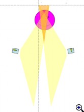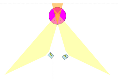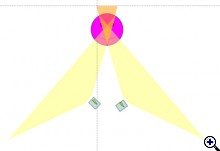 Bevilágítja. De kisebb fénnyel. A sötétebb háromszöget viszont két vaku villantja be. Az világosabb lesz. Ergo ha játszok a vaku teljesítménnyel és a géppel akkor kapot egy fejgépet a témán. Ja én felül nézetből rajzolok. Te meg a kamera mögül. :) |