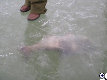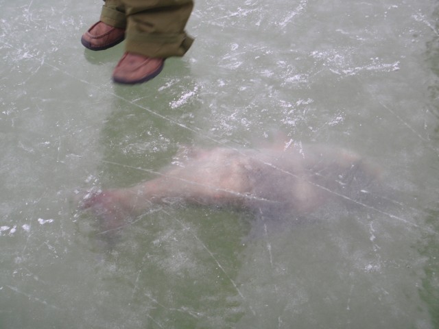 Még mozgott, szegény, de alig volt már oxigénje (és helye). Jó nagy darab volt, kb 80-90 cm, kövér példány. Néhány befagyott halat láttunk még ezen kívül, de százszámra láttunk élő, rajban mozgó sneciket. |