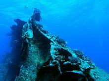 A merülés ismertetésekor felhívtam John figyelmét, hogy ne kalandozzon el, mire megnyugtatott, hogy tudja, ez egy komolyabb merülés. A párok beosztásánál előre vettem az angol házaspárt, utánuk a hollandokat. A hajó lekötését végző búvárvezető nagyon erős áramlásról számolt be a felső 15 méteren (ez itt szinte megszokott). A terv az első merülésen a roncs körbeúszása volt. Mivel az elején voltunk kikötve, ez azt jelentette a gyakorlatban, hogy az áramlással elmegyünk a hajócsavarig, majd a kevésbé áramló oldalon visszajövünk. A fordulási nyomást 140 bárra beszéltük meg, hiszen visszafelé áramlással szemben kell úszni. A beöltözés simán ment.