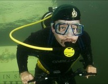 A Surrey megyei tűzoltó és egyben PADI dive master, Chris Sirett felváltva tekert egy búvároktató, Mark Bruce párjaként. A két búvár ugyanis búvárruhába bújt, felkapták a palackjaikat és a víz alá merültek Staines-ben, a Wraysbury Dive Centerben hogy biciklire pattanjanak. Összesen nyolc órán át tekertek, órás váltásokban. A bicikli egy platformra volt rögzítve.A két búvár figyelemfelhívó akciójával 1,300 fontot gyűjtött össze a Help for Heroes szervezet számára, ami sebesült katonákat és azok családjait támogatja. Az 52 esztendős Sirett maga is a királyi haditengerészet kötelékében szolgált, és arról beszélt, hogy szürreális élmény volt a víz alatti tekerés, de az óránkénti 8 mérföldes átlagre (összesen 64 mérföldet mért a kerékpár komputere) elégedett. A legnagyobb nehézséget a hideg víz, a fáradtság és a kiszáradás jelentette.